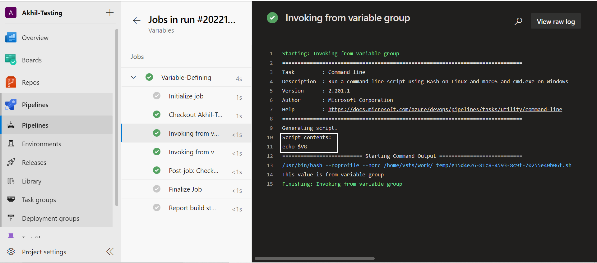 Here in the pipeline, we have defined two scripts one for fetching values from the variable group and another for fetching values from the variable template.